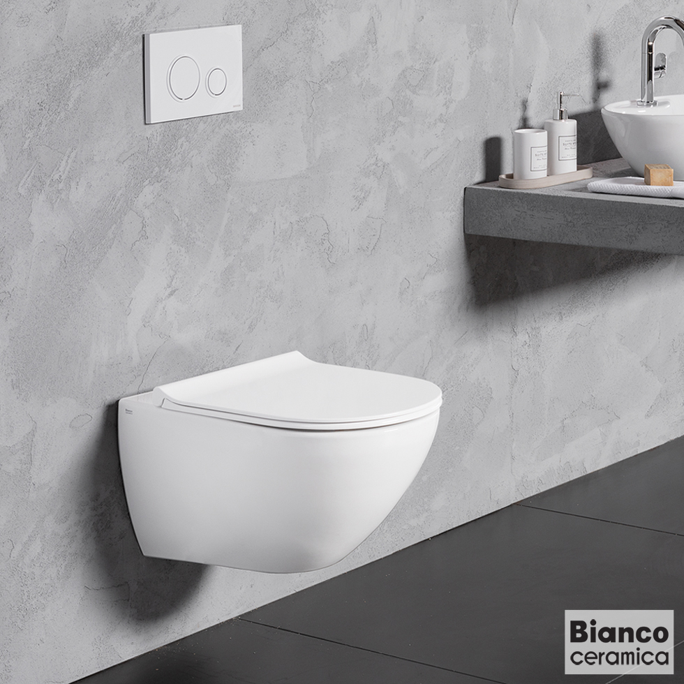 Λεκάνη REMO RIMLESS κρεμαστή, προβολής 56 εκ., με αποσπώμενο κάλυμμα βακελίτη Slim soft-close, BIANCO CERAMICA