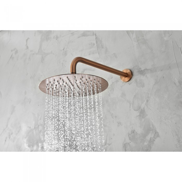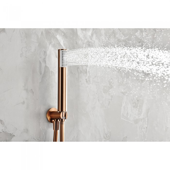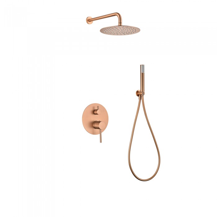 Μπαταρία ντουζιέρας εντοιχισμού Ροζ Χρυσό Ματ/Χαλκού που περιλαμβάνει, ανοξείδωτο μίκτη εντοιχισμού 2 εξόδων με εκτροπέα, ανοξείδωτη ανακλινόμενη κεφαλή Φ.25 με inox επιτοίχιο μπράτσο μήκους 35cm καθώς και Slim Τηλέφωνο χειρός με βάση στήριξης, Σπιράλ PVC 150cm και Παροχή σπιράλ. Διαθέτει τους εσωτερικούς της μηχανισμούς και τεχνολογία κεραμικών δίσκων. Το υλικό της κατασκευής της είναι από 100% άριστης ποιότητάς ατόφιο ανοξείδωτο αντιμαγνητικό ατσάλι 304. Διατίθεται σε Ροζ Χρυσό Ματ/Χαλκού φινίρισμα. Το φινίρισμα της μπαταρίας διαθέτει ειδική επίστρωση PVD, μια ανώτερη επίστρωση για τα περισσότερα προϊόντα χάλυβα. Είναι τέσσερις φορές πιο σκληρή από το χρώμιο, και ως εκ τούτου πιο ανθεκτική στις γρατζουνιές και τη διάβρωση.