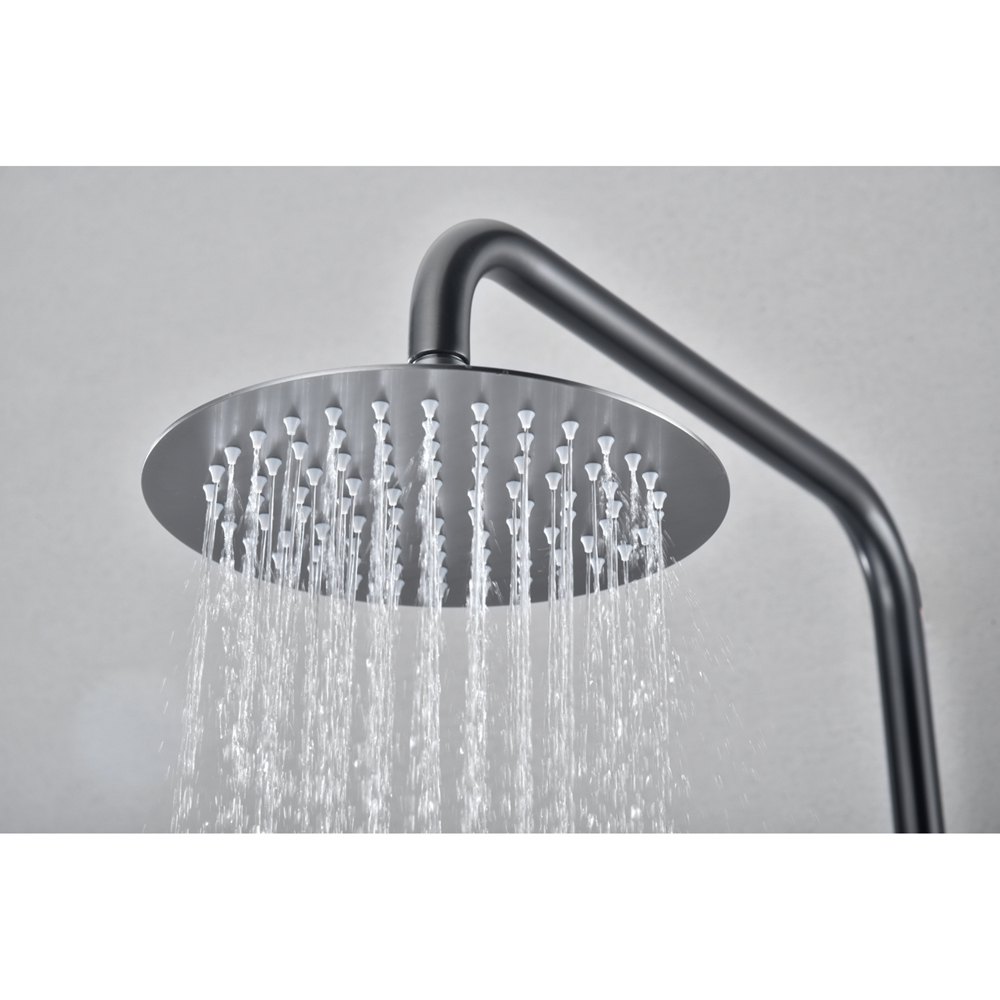Στήλη Ντους με Μπαταρία 2 εξόδων σε Black Gun Metal PVD φινίρισμα .Διαθέτει κεραμικό δίσκο 35mm, ανακλινόμενη Κεφαλή ντουζιέρας Φ.20cm με βραχίονα τοίχου ,τηλεσκοπική κολόνα με αυξομειώμενο ύψος 95cm έως 132cm, Ορειχάλκινη στρογγυλή αναμεικτική μπαταρία με εκτροπέα 2 θέσεων, για τηλέφωνο και κεφαλή και λεπτό χερούλι για ρύθμιση της θερμοκρασίας και ρύθμισης του νερού καθώς και τηλέφωνο χειρός από πλαστικό pvc με ρυθμιζόμενη βάση στήριξης καθώς και Σπιράλ 150cm.Μέγιστη αντοχή στην φθορά και στην οξείδωση.