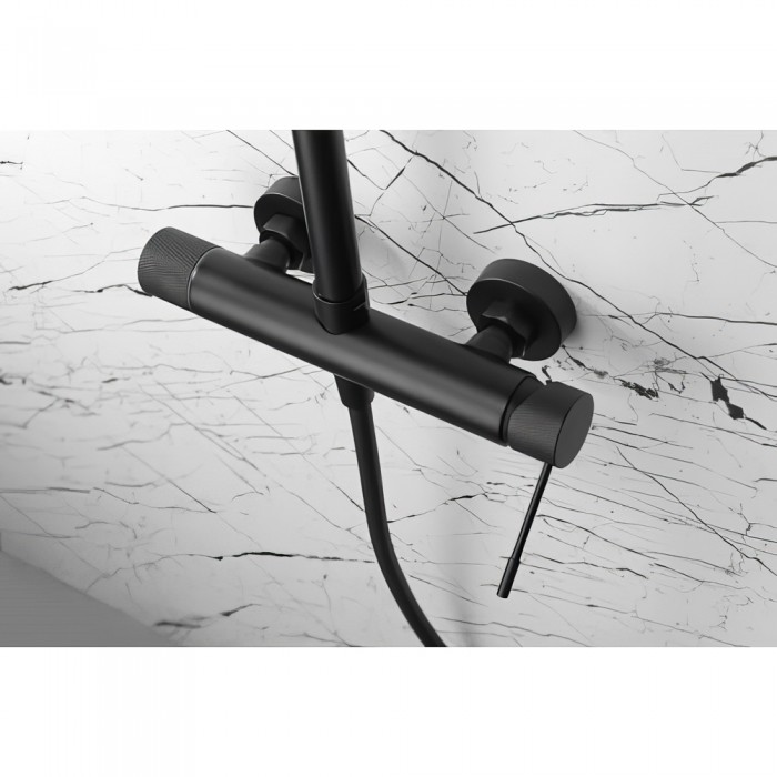 Στήλη Ντους με Μπαταρία 2 εξόδων σε Μαύρο Ματ φινίρισμα .Διαθέτει κεραμικό δίσκο 35mm, ανακλινόμενη Κεφαλή ντουζιέρας Φ.20cm με βραχίονα τοίχου ,τηλεσκοπική κολόνα με αυξομειώμενο ύψος 95cm έως 132cm, Ορειχάλκινη στρογγυλή αναμεικτική μπαταρία με εκτροπέα 2 θέσεων, για τηλέφωνο και κεφαλή και λεπτό χερούλι για ρύθμιση της θερμοκρασίας και ρύθμισης του νερού καθώς και τηλέφωνο χειρός από πλαστικό pvc με ρυθμιζόμενη βάση στήριξης καθώς και Σπιράλ 150cm.Μέγιστη αντοχή στην φθορά και στην οξείδωση.