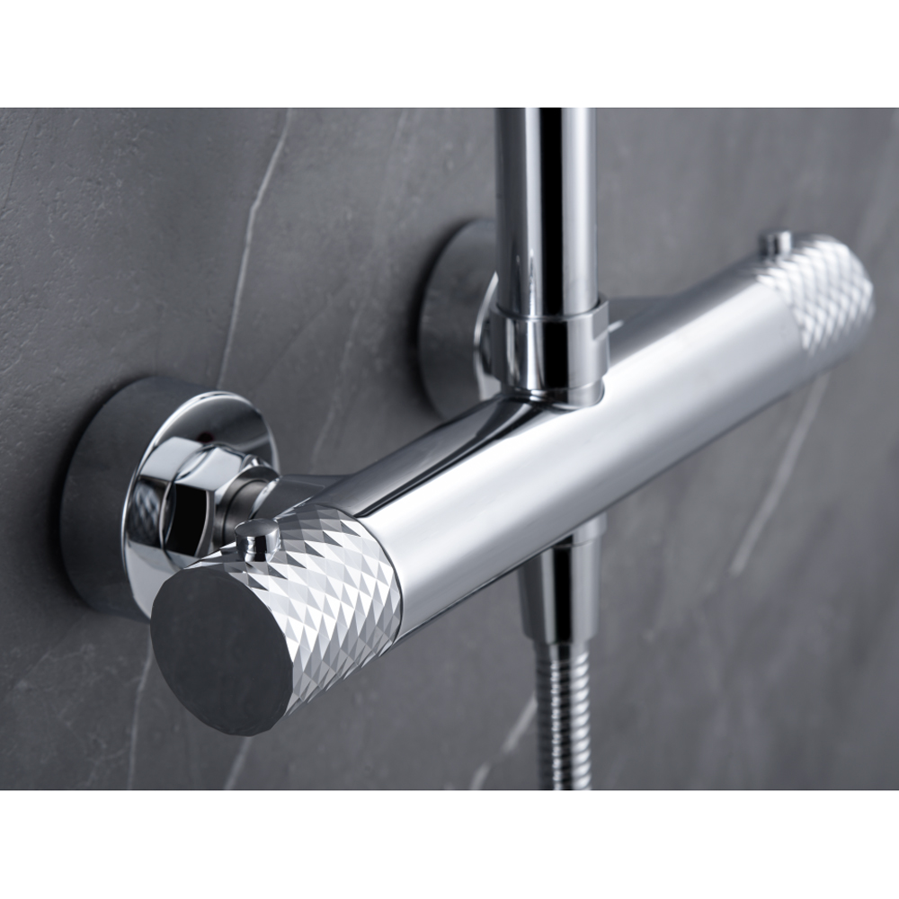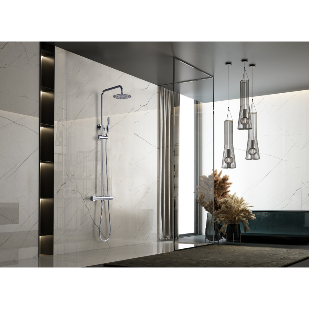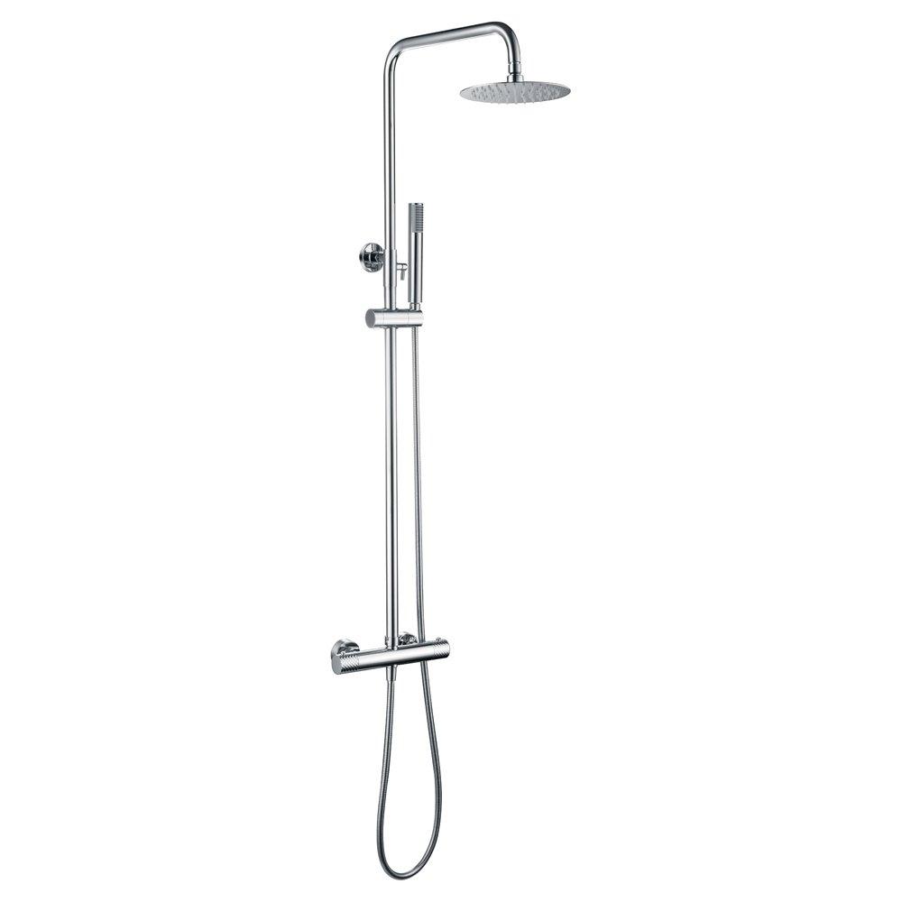 Στήλη Ντους με Μπαταρία 2 εξόδων σε Χρωμέ φινίρισμα .Διαθέτει κεραμικό δίσκο 35mm, ανακλινόμενη Κεφαλή ντουζιέρας 20cm με βραχίονα τοίχου ,τηλεσκοπική κολόνα με αυξομειώμενο ύψος 88cm έως 124cm, Ανοξείδωτη στρογγυλή αναμεικτική μπαταρία με εκτροπέα 2 θέσεων, για τηλέφωνο και κεφαλή και τετράγωνο χερούλι για ρύθμιση της θερμοκρασίας και ρύθμισης του νερού καθώς και τηλέφωνο χειρός από πλαστικό pvc με ρυθμιζόμενη βάση στήριξης καθώς και Σπιράλ 150cm.Μέγιστη αντοχή στην φθορά και στην οξείδωση.